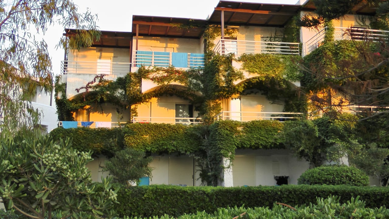 Ein Blick auf einige Zimmer im Bungalow-Stil. Diese Aufnahme ist am frühen Morgen aufgenommen. Mit Blick auf den Haupt-Pool und teilweise auf das Meer, kann man von diesen Bungalow-Zimmern den Sonnenaufgang genießen