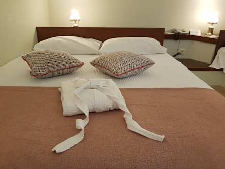 Das große und bequeme Doppelbett in einem Bungalow-Zimmer. Die Servicekräfte kontrollieren täglich mehrfach die Zimmer auf Sauberkeit und Ordnung (wenn per Tür-Karte gewünscht). Es gibt (bei Bedarf) täglich frische Handtücher.