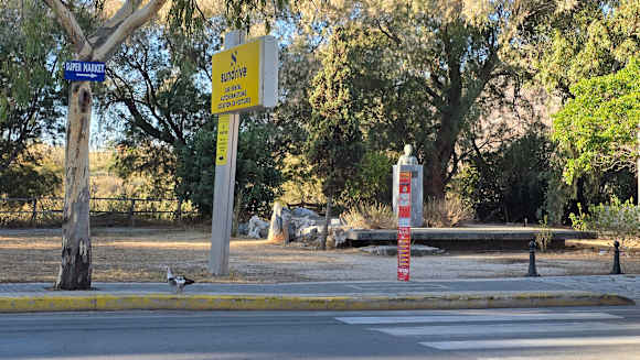 Gegenüber dem Hoteleingang: Bushaltestelle (Ente Theo achtet hier auf die Sicherheit der Gäste), Infos zur Autovermietung und Angebote für Ausflüge in die Umgebung.