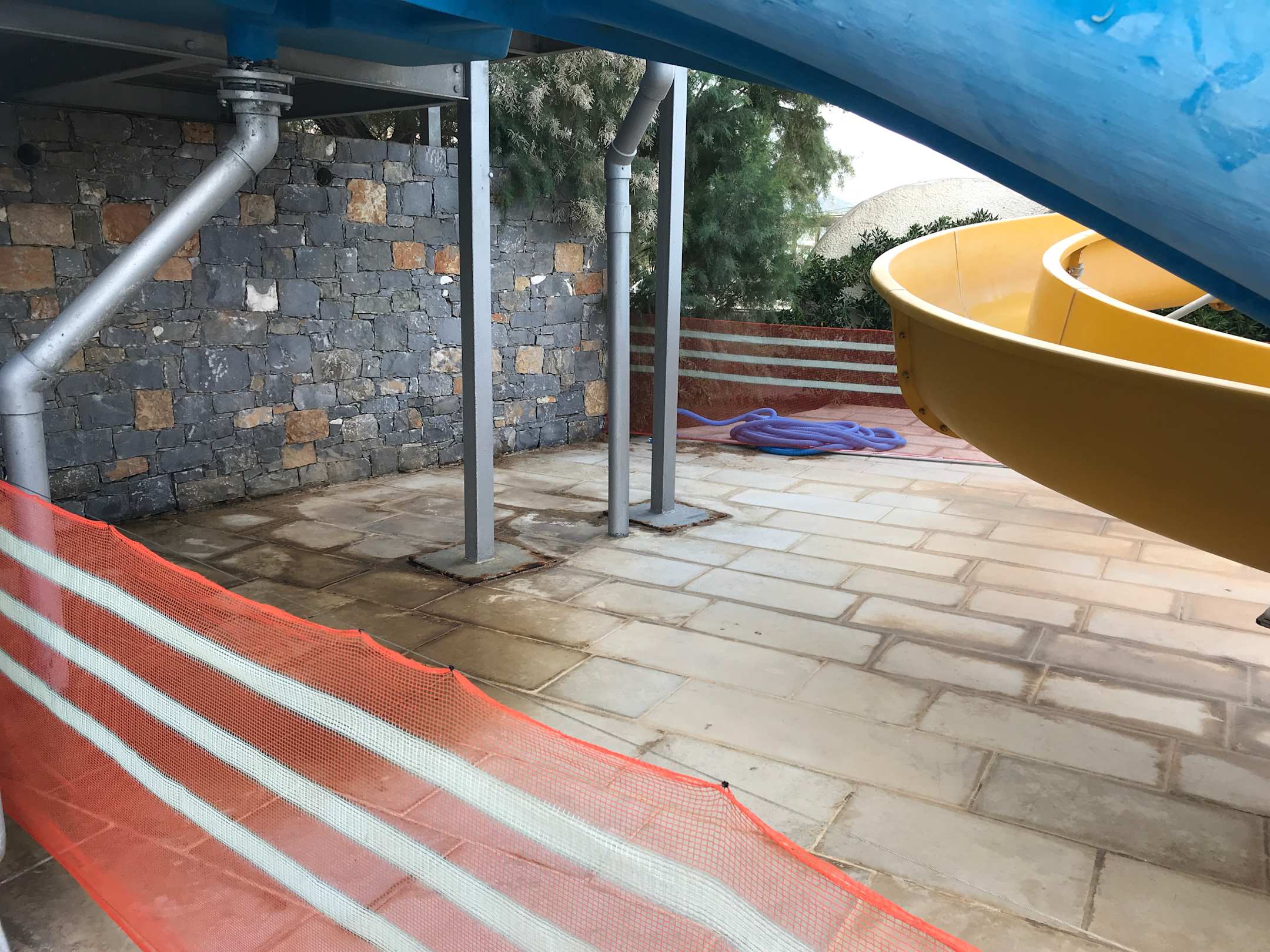 PoolKinderrutschen. Aus Sicherheitsgründen mit einem mobilen Bauzaun abgesperrt. Die Rutschenanlage wirkt sehr ungepflegt und in die Jahre gekommen.