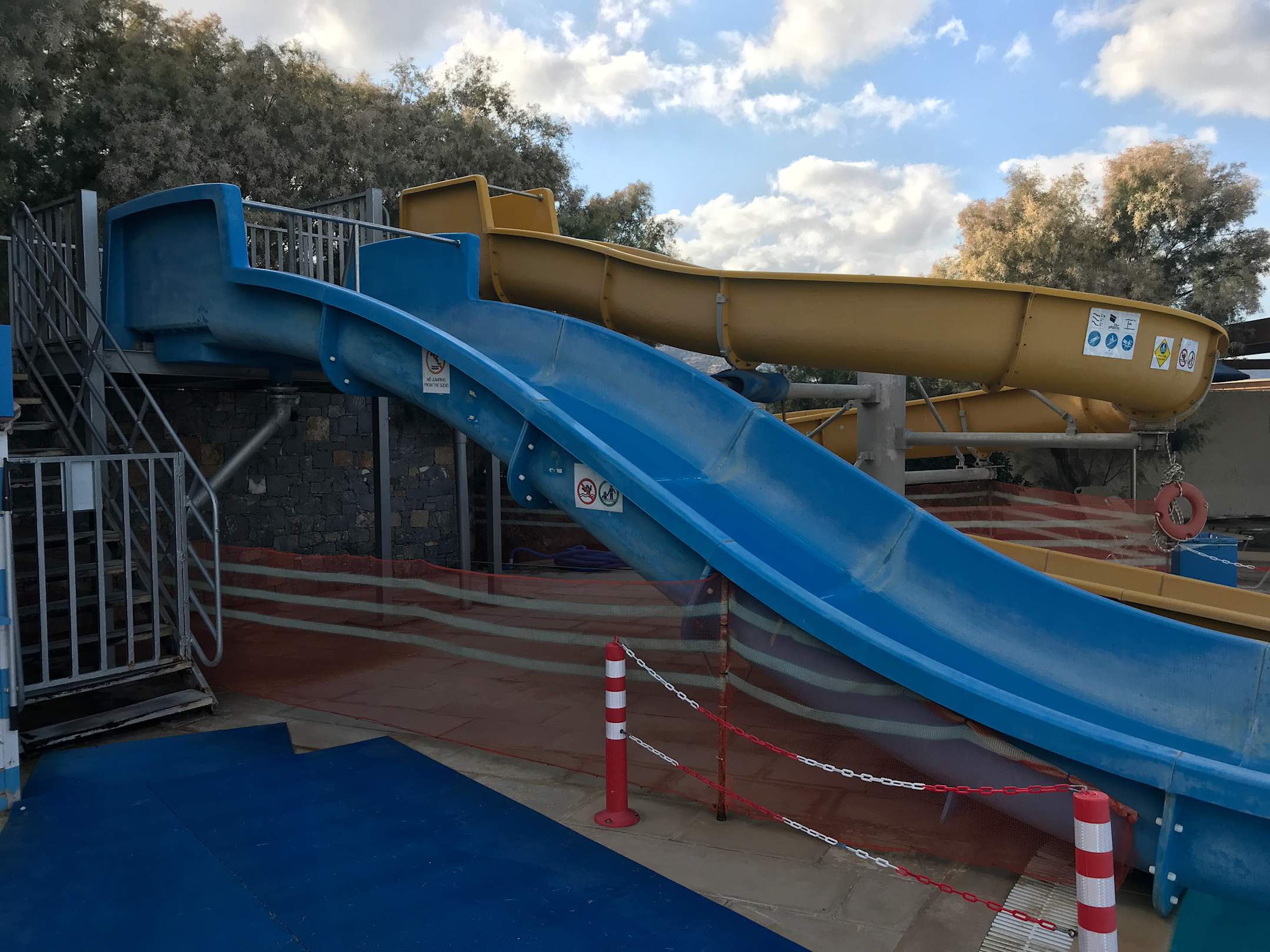 PoolKinderrutschen. Aus Sicherheitsgründen mit einem mobilen Bauzaun abgesperrt. Die Rutschenanlage wirkt sehr ungepflegt und in die Jahre gekommen.