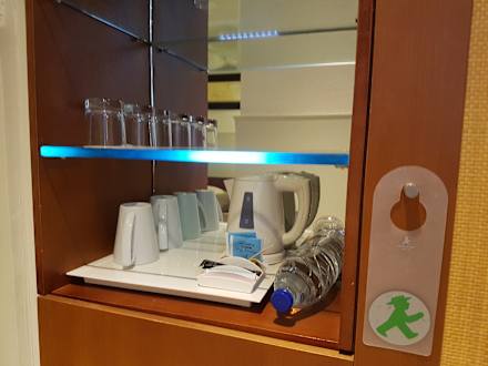Ein Kühlschrank mit frischem Wasser (2. Flasche) und diversen alkoholfreien Erfrischungsgetränken. Es gibt einen Wasserkocher, ausreichend Tassen/Gläser und täglich eine Auswahl an verschiedenen Tee-Sorten.