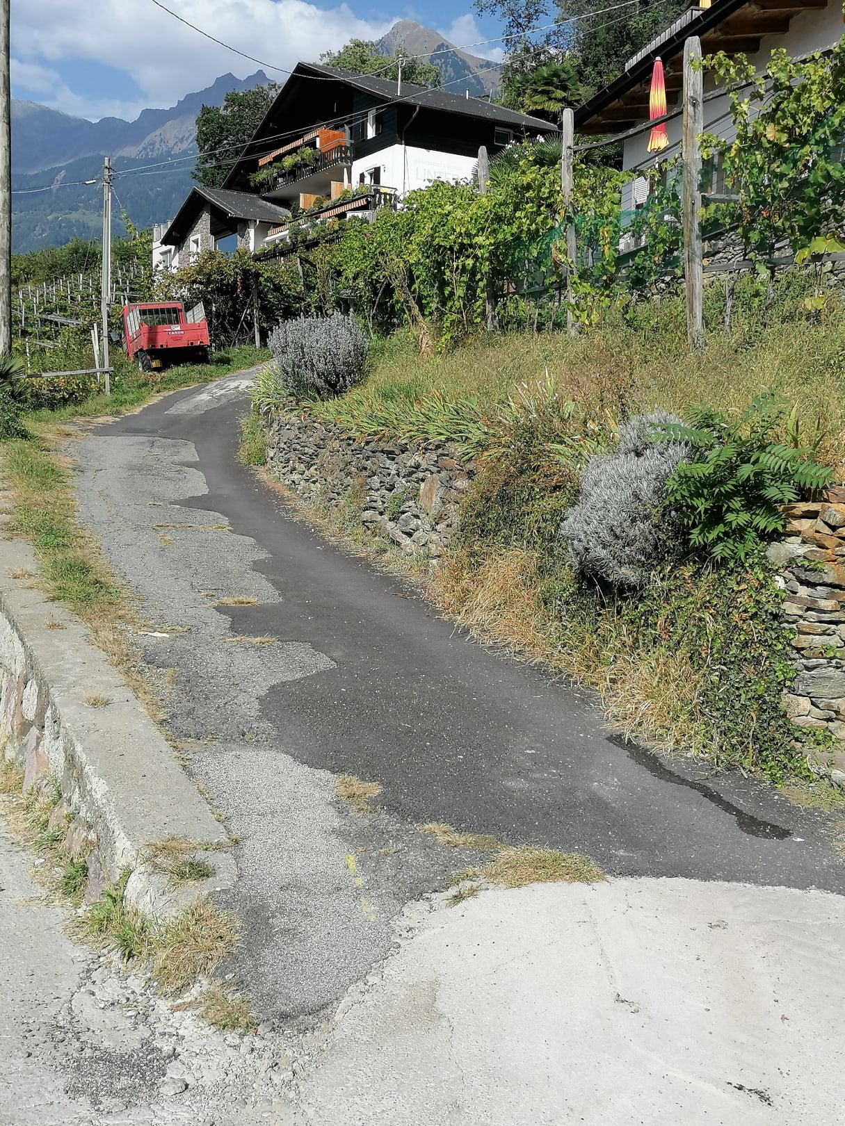 Jetzt nochmal mit Schwung hinauf, sonst wuergt jeder Motor ab, und oben am Haus schnell zum Stand kommen. Wenden sehr eng, nach unten unuebersichtlich