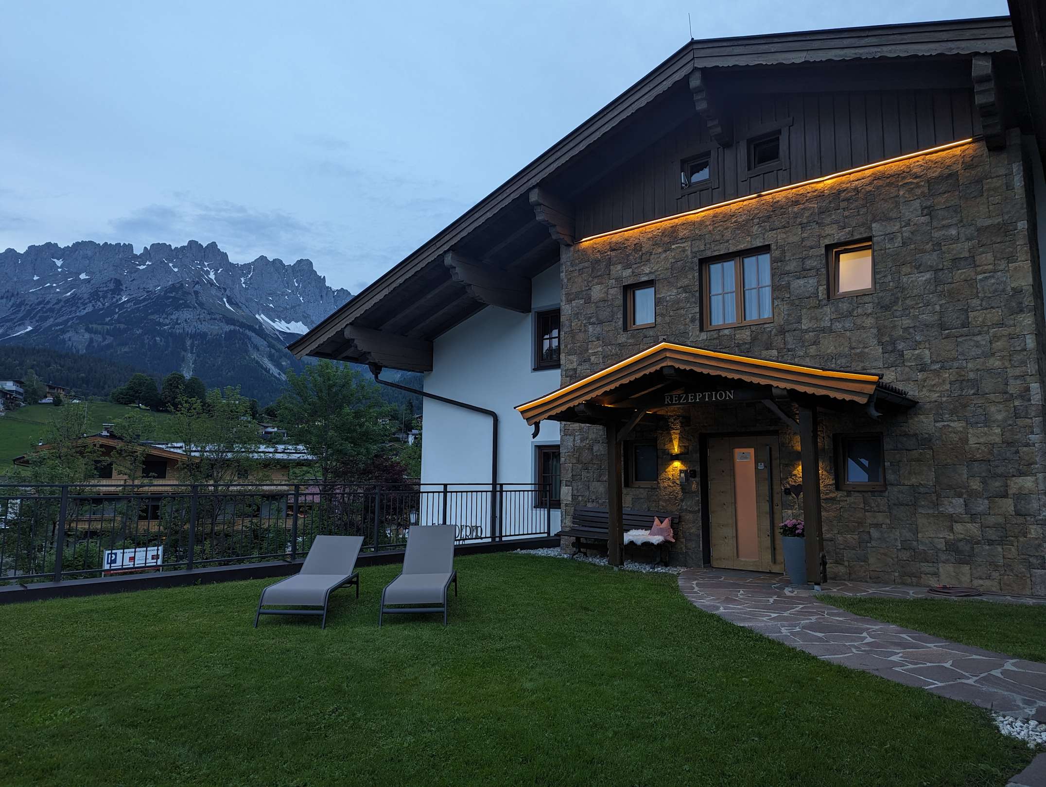Außenansicht abends vom Eingang