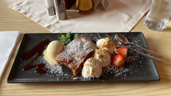 Apfelstrudel mit Vanilleeis und Sahne 🤤.