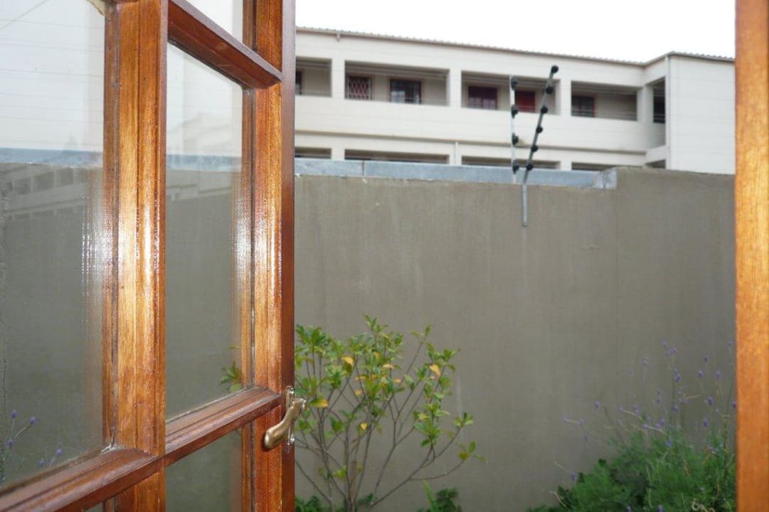 Zimmerausblick auf Mauer und Elektrozaun