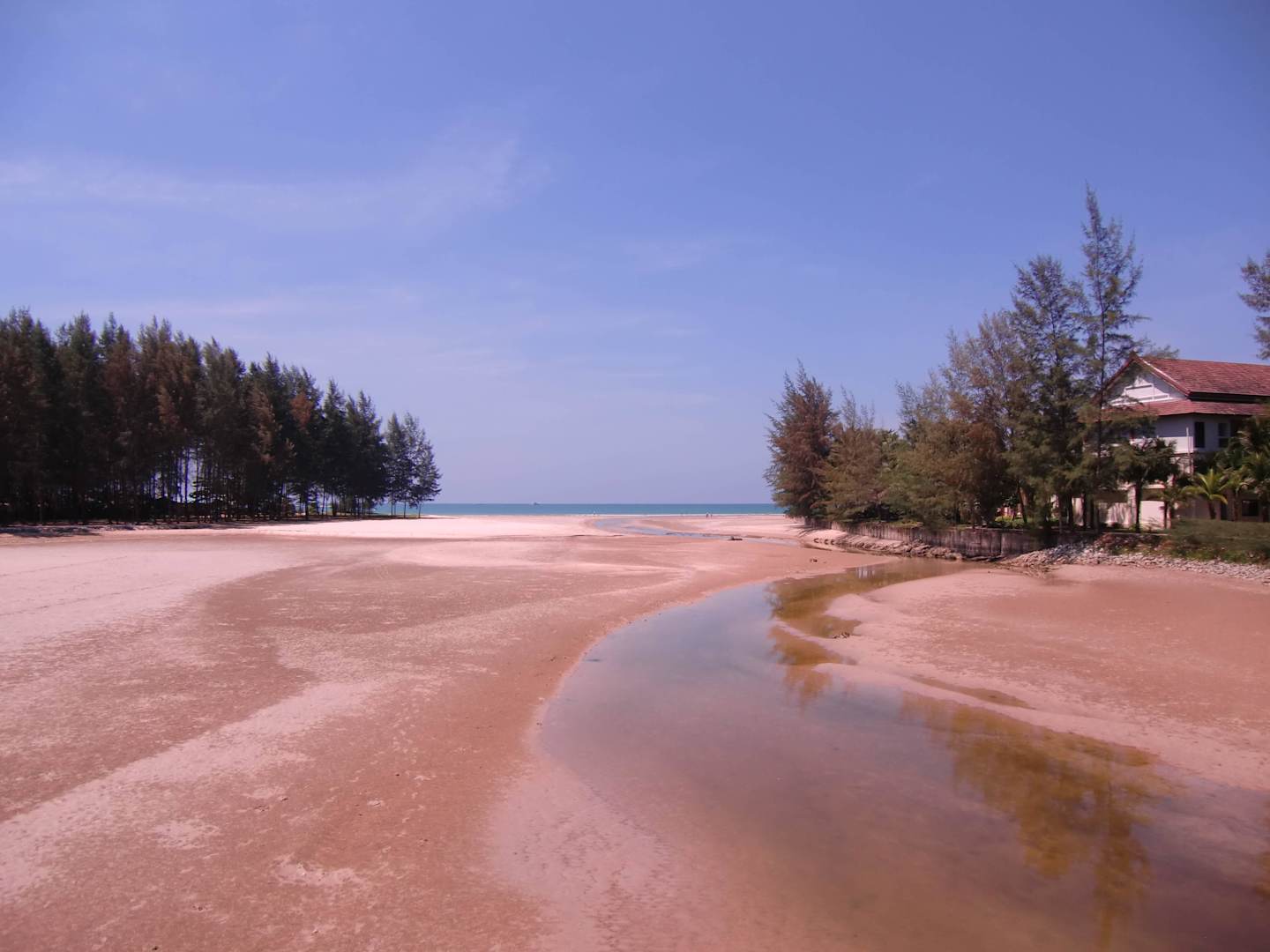 Lagune bei Ebbe von der Brücke zu den Villen ausRechts ist etwas von der Hotelanlage zu sehen; links vorn von den Bäumen verdeckt ist das Memories