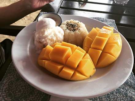RestaurantCoconut Mango Sticky Rice mit extra Kokosnusseis an der Zeus Beach Bar (sehr empfehlenswert!)