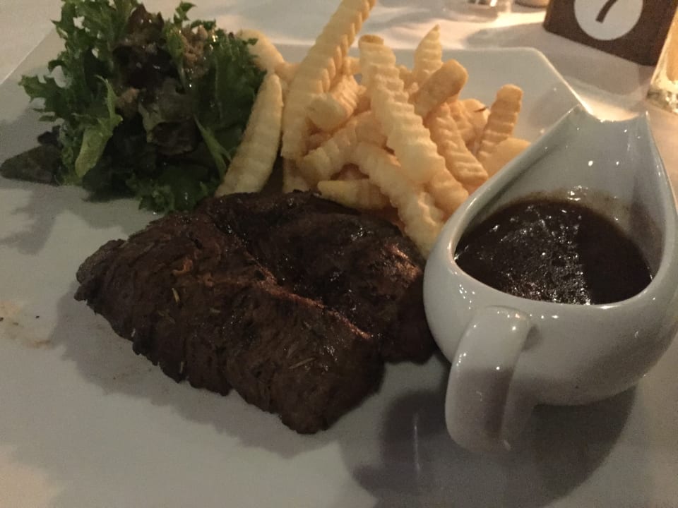 Steak, Salat, Pommes und Sauce an der Zeus Beach Bar