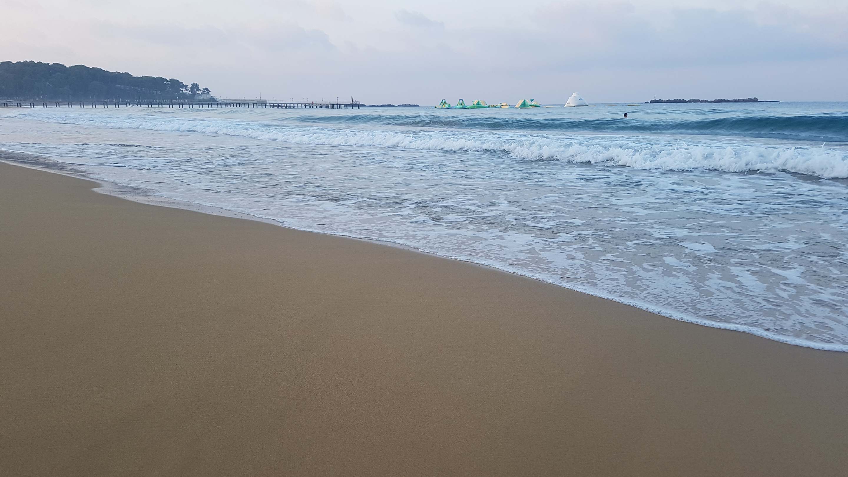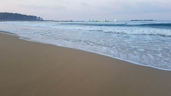 Flacher Strand mit "Wipe-Out" im Hintergrund