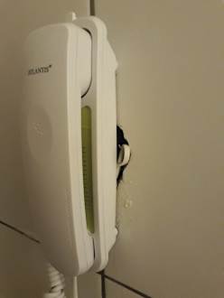 Dieses Telefon Stand im Bad und dahinter kamen offene Leitungen heraus.