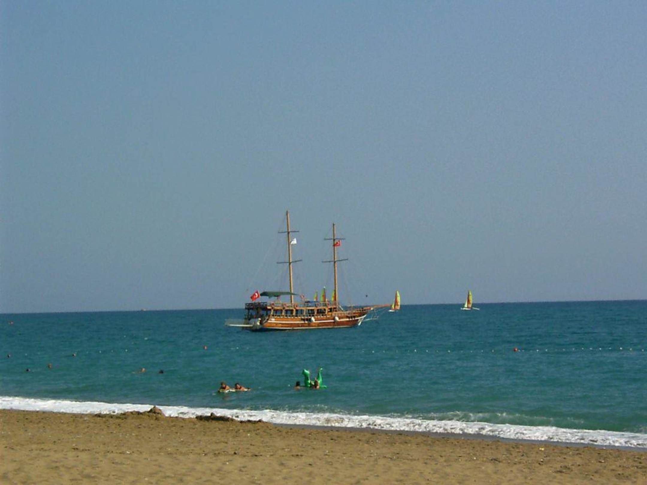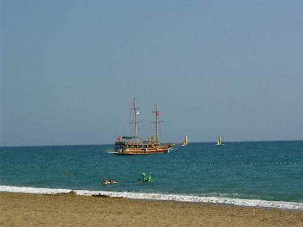 Blick aufs Meer auf das Ausflugsschiff zur Delfinefahrt. Die meisten haben zwar keine Delfine gesehen, waren aber trotzdem restlos begeistert.
