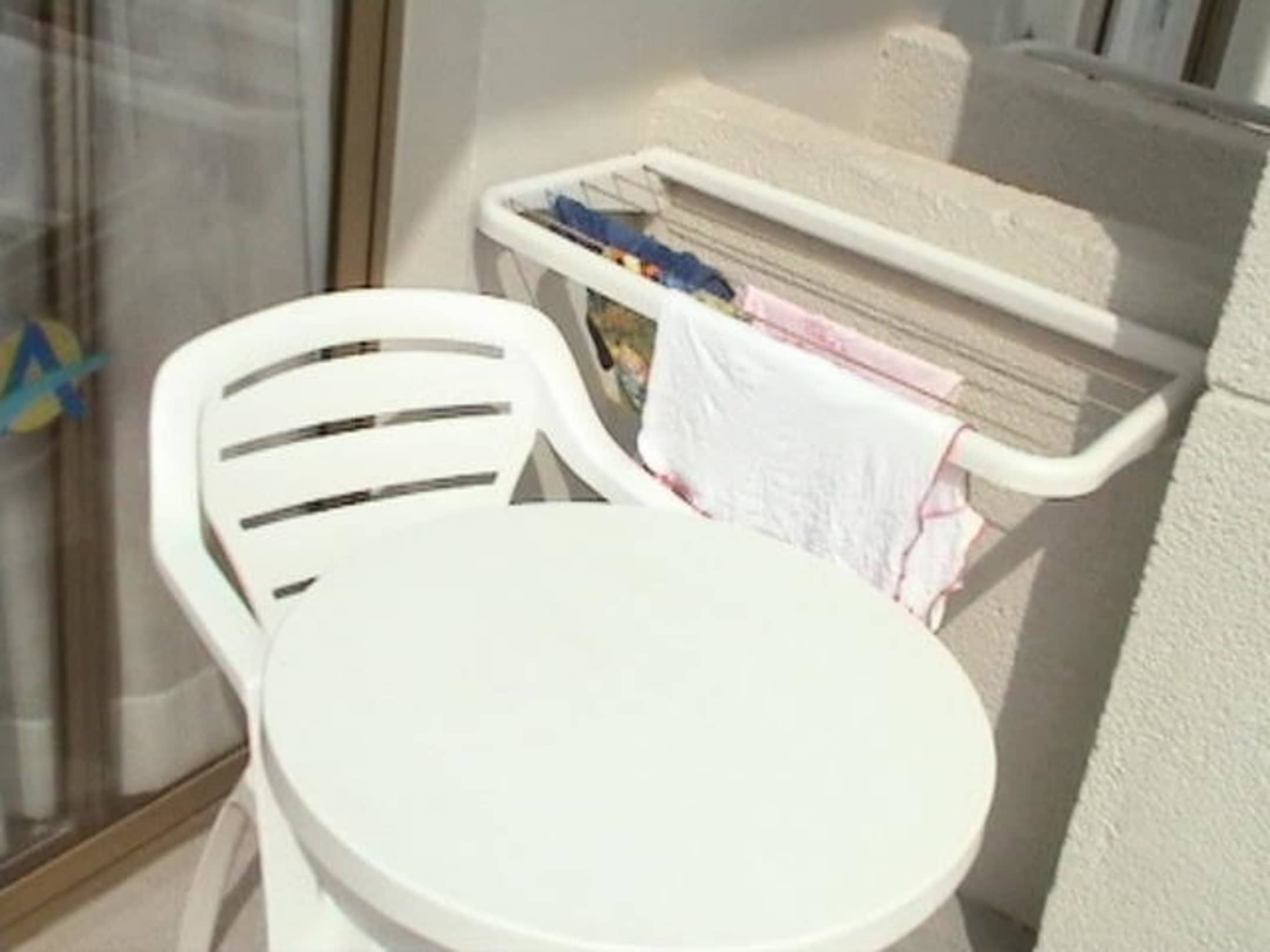 Hier sehen Sie den Tisch mit Stühlen und den Trockner.