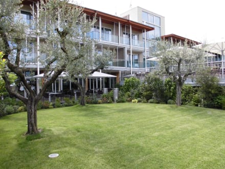 Blick vom Garten auf die Frühstücksterrasse