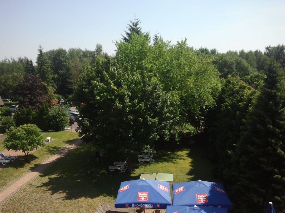 Ausblick vom Balkon auf den Garten.