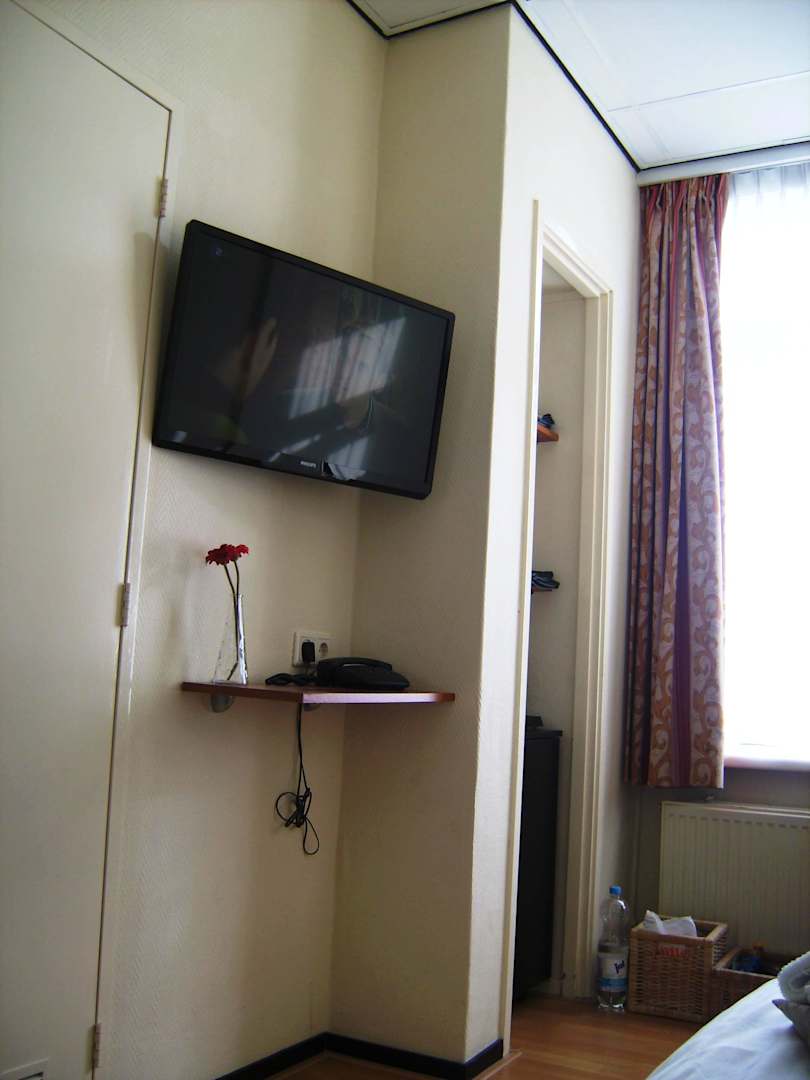 TV und Ablage, dahinter Kühlschrank und Regal
