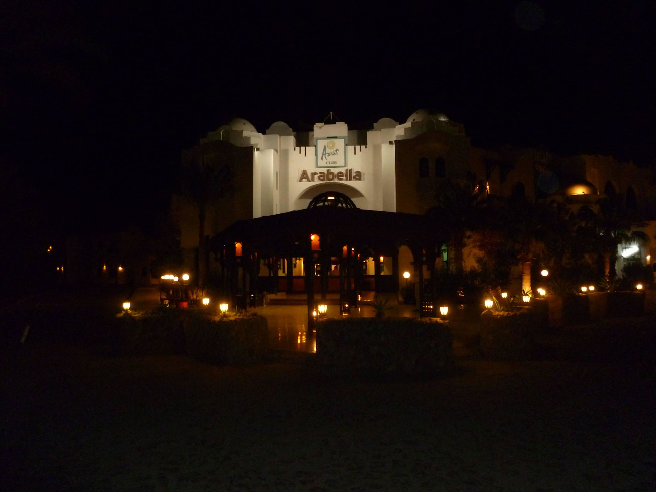 Blick im dunkeln auf den Eingang des Hotels