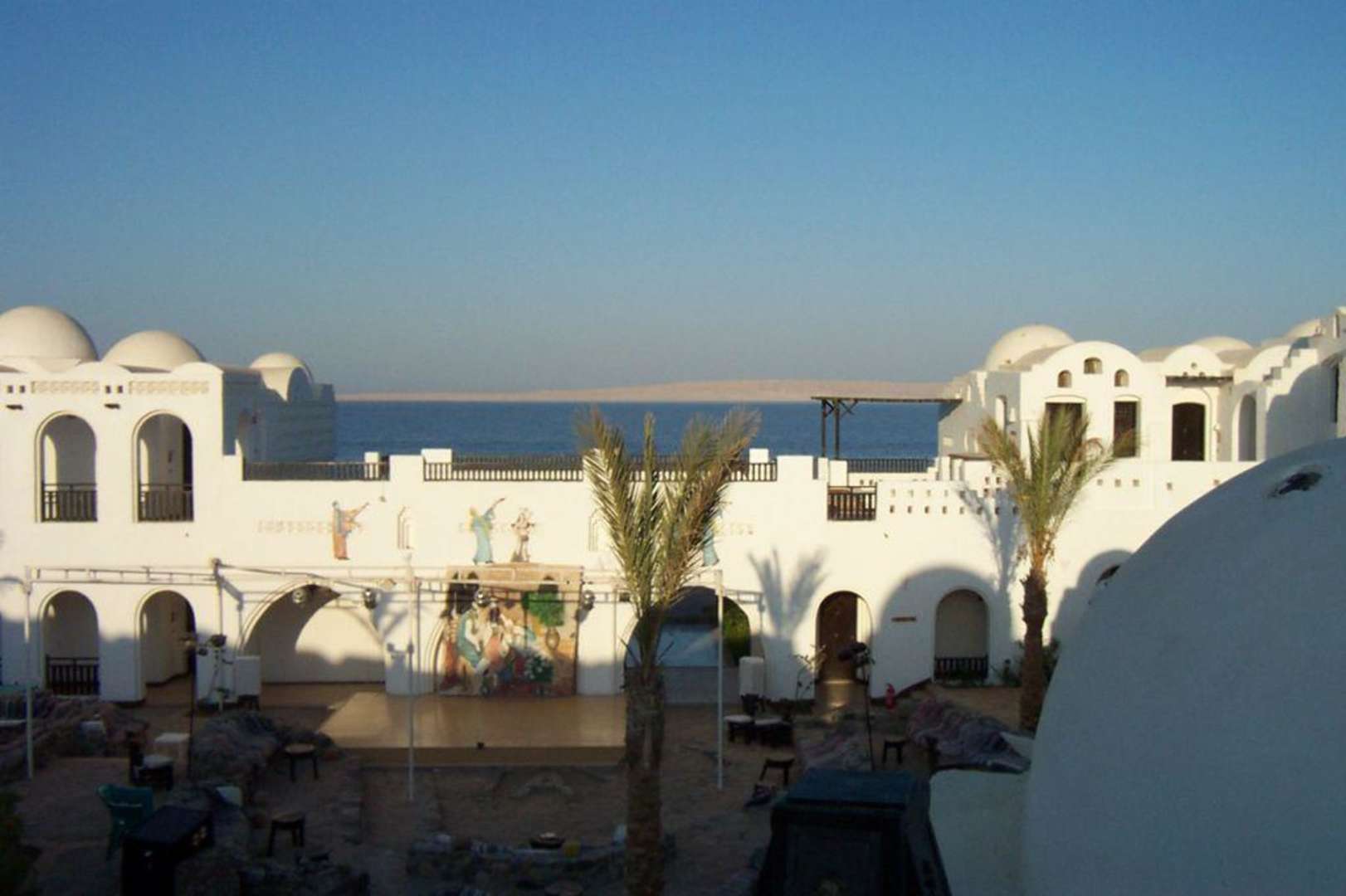 Ausschau auf die Animationsbühne im orientalischen Stil, dahinter gelegen direkt das Meer. Schöne Stunden mit abwechslungsreichem Programm und Wasserpfeife. :-)