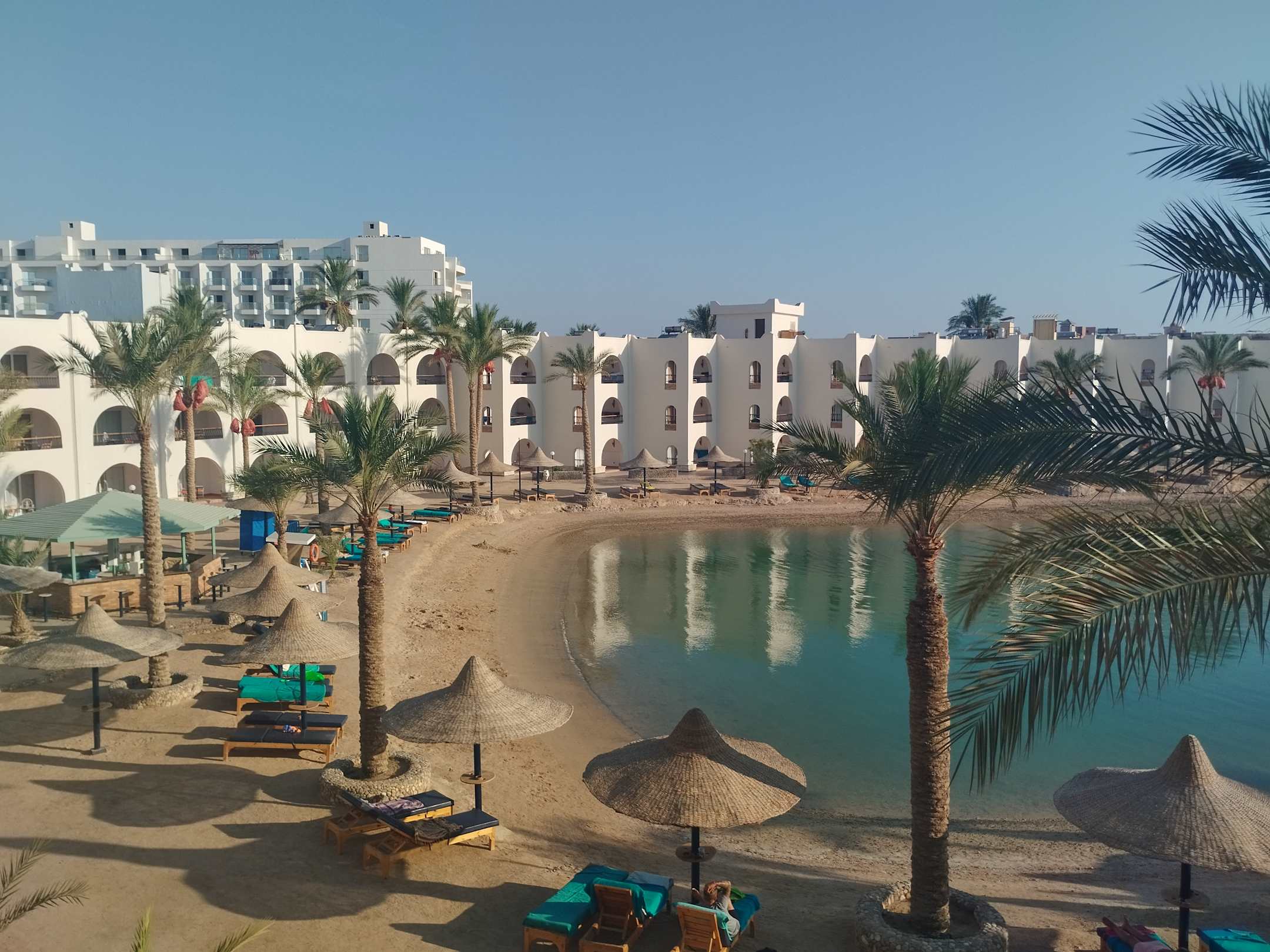 Vom Balkon aus 1 von mehreren Strandabschnitten mit Bar. Liegen waren mit Handtüchern immer schon früh belegt. Schade, daß es immer noch solche Leute gibt, die so etwas nötig haben.