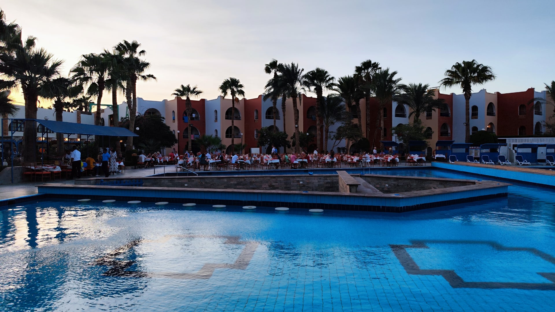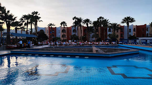 Pool zur Zeit des Abendbuffets, Swimup-Bar soll reaktiviert werden.