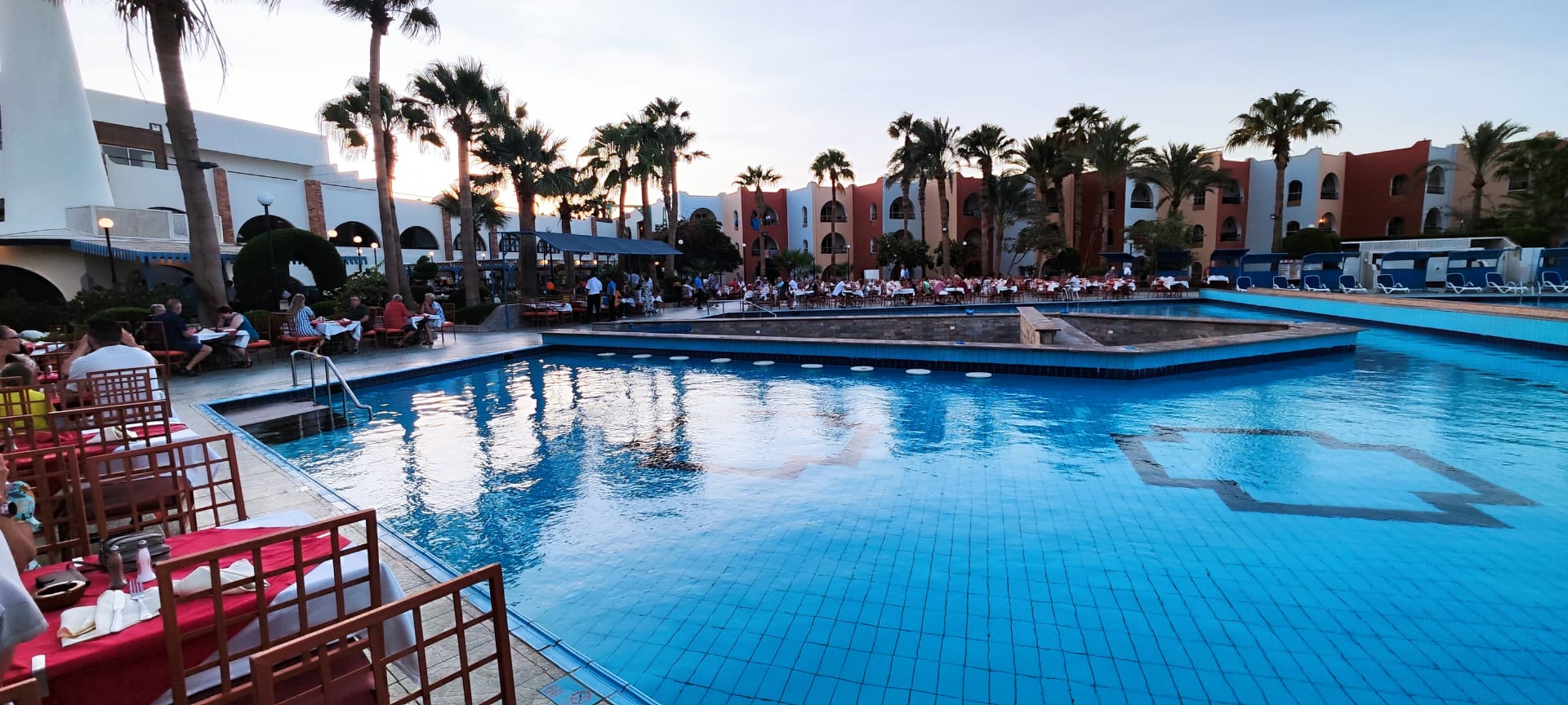 Pool zur Zeit des Abendbuffets, Swimup-Bar soll reaktiviert werden.