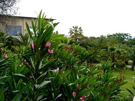 Exotische Büsche und Pflanzen neben dem Balkon