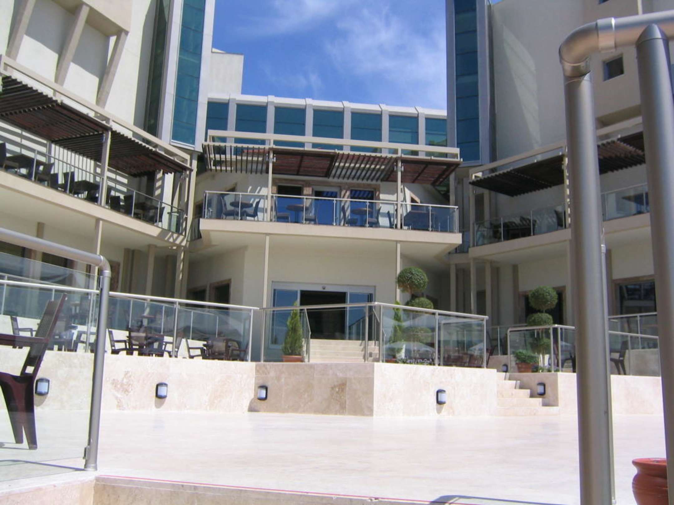 Aussenaufnahme des Hoteleingangs vom Pool aus