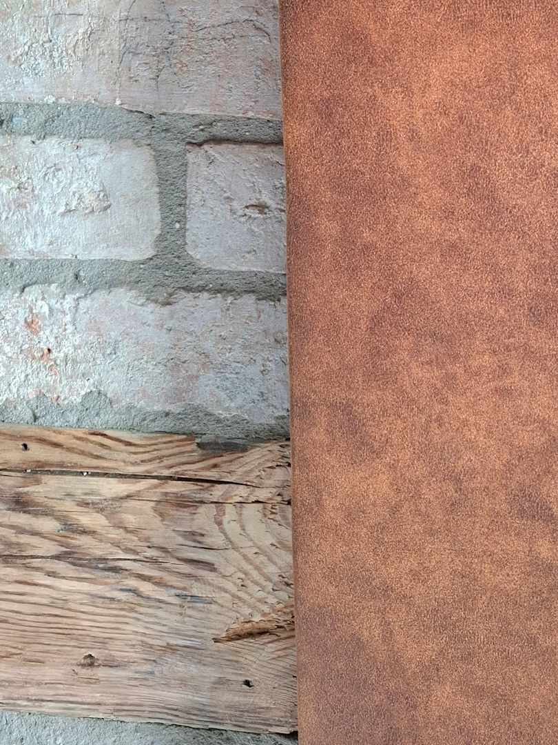 ZimmerMaterial-Mix. Bettkopf aus grobrm Leder, unverputzte Backsteinwände, Fachwerk aus Holz...