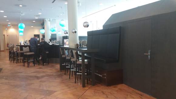 verschiedene Bereiche der Lobby mit Sitzgelegenheiten und Bar