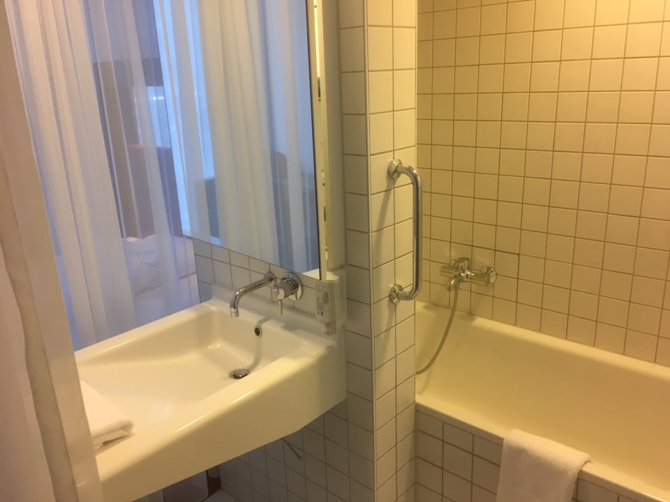 Badewanne mit Duschecke, Waschbecken mit eingebautem Intelligenztest, zumindest ich habe eine Weile gebraucht, herauszufinden dass der kleine Hebel rechts unterm Waschbecken für den Stöpsel ist ;)
