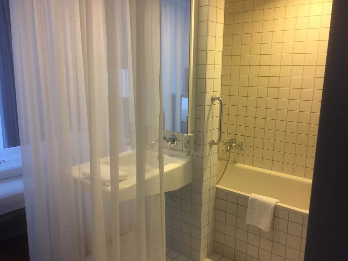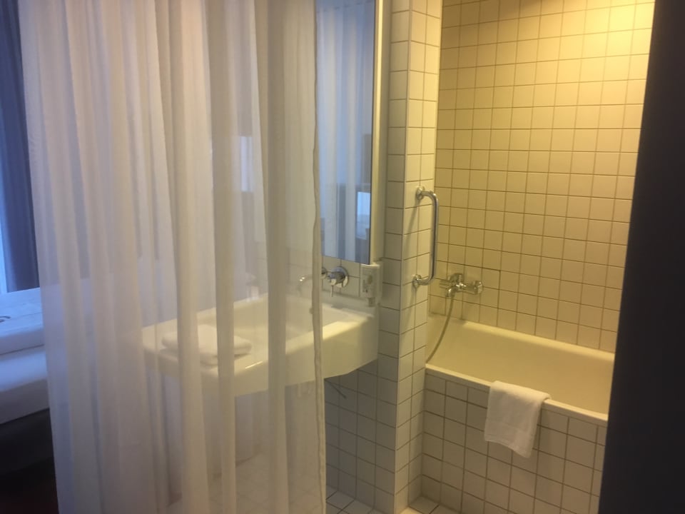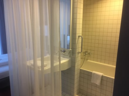 offenes Bad, nur durch einen zarten Vorhang vom Zimmer getrennt