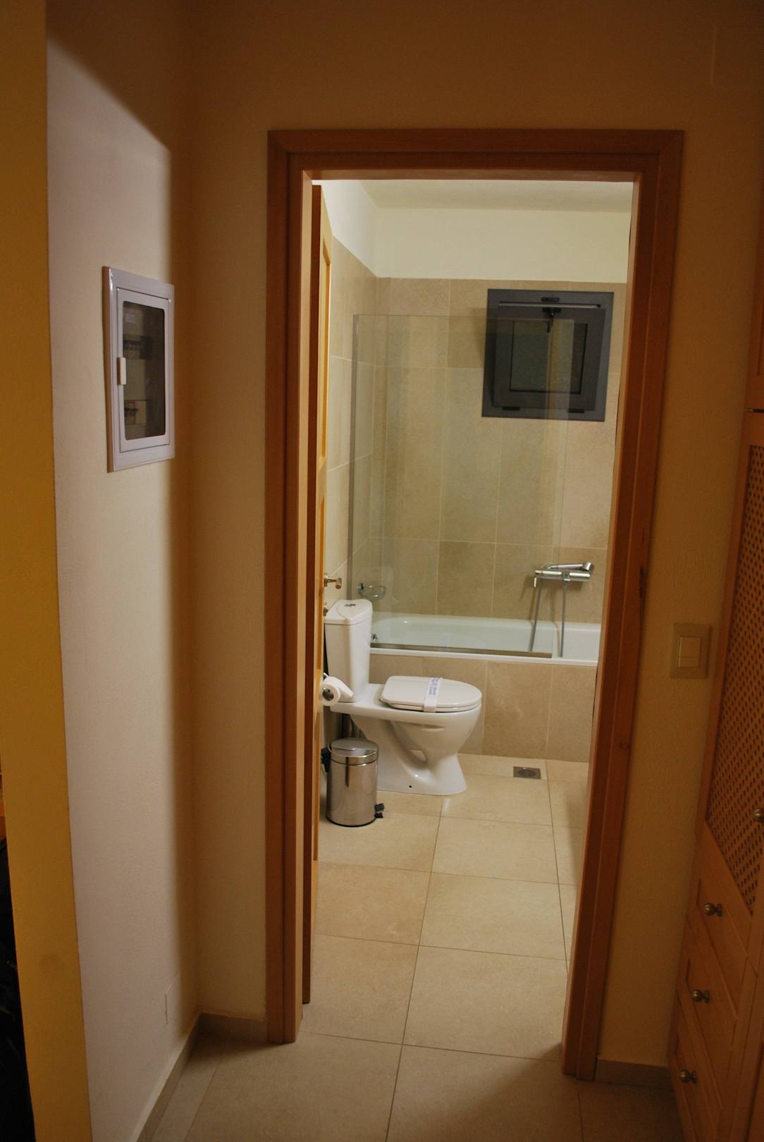 Wejście do łazienki i korki na ścianie.