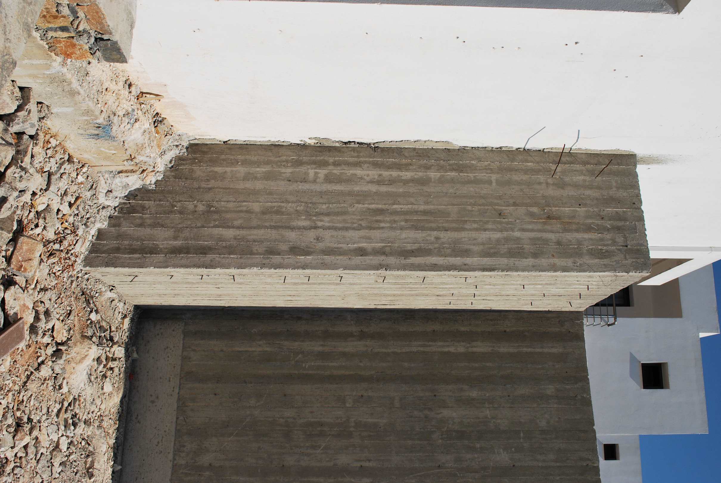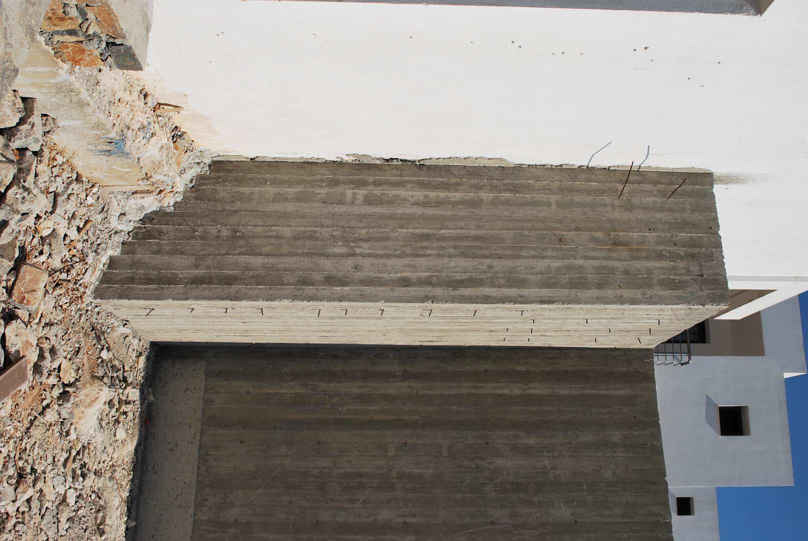 Wystające stalowe pręty koło nowych budynków.