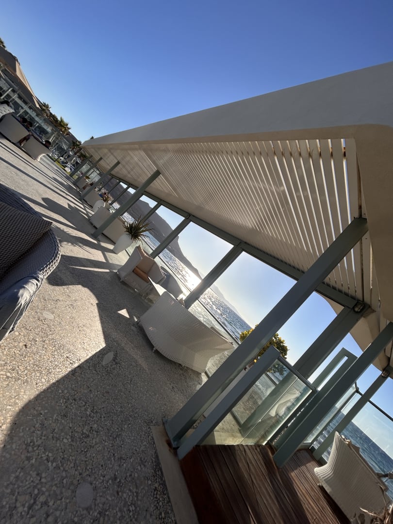 Blick von der Poolbar über den Strand bis zum Meer