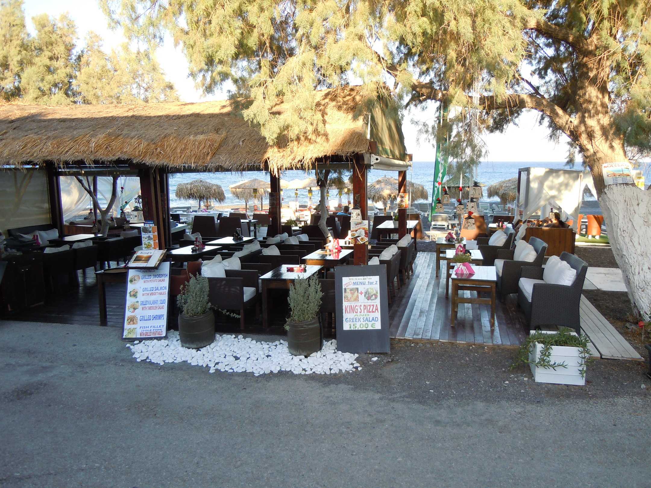 Blick auf den Hotelstrand hinter einer Taverne