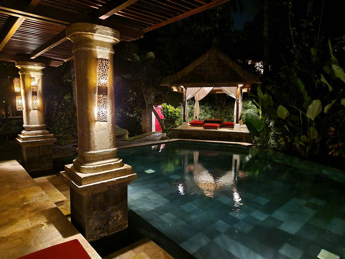 Aussicht auf den Pool im Dunklen.