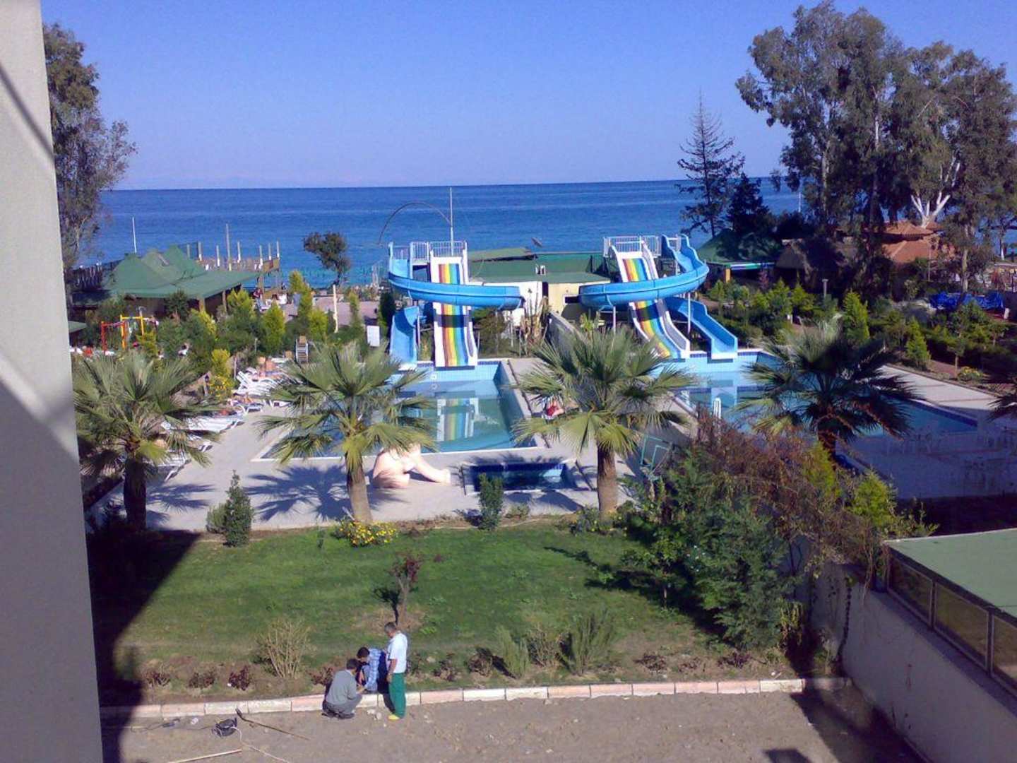 Rückseite HotelAussicht auf den hinteren Teil des Hotels Richtung Strand vom Balkon aus (inkl. Bauarbeiten an der Terrasse)