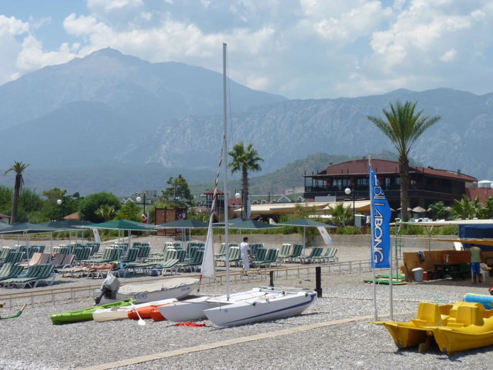 Blick vom Steg gen Gebirgedieser Teil des Strandes gehört nicht zum Labada, aber das tretboot kann kostenlos benutzt werden
