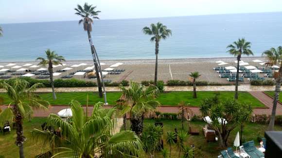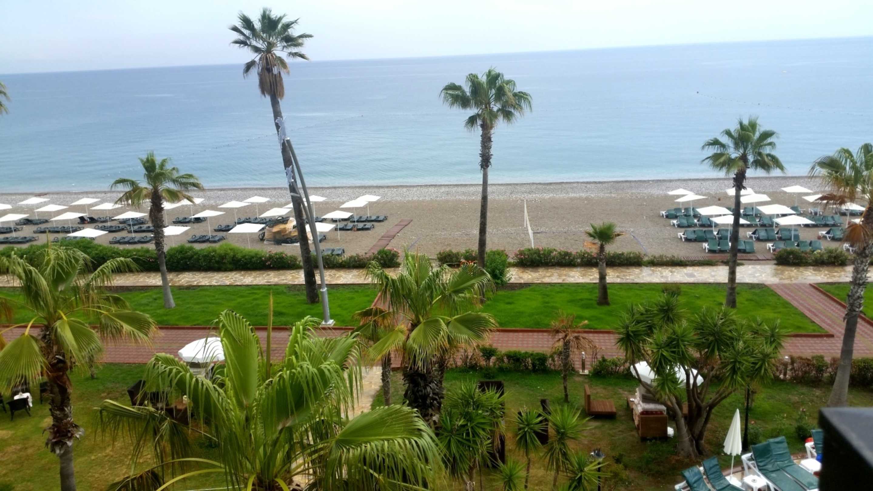 Der Strandabschnitt für das Hotel. Man kann rechts oder links die Liegen belegen. Gegen Entgelt gibt es zwischen den Palmen bequeme Sitze, um Wasserpfeife zu rauchen.