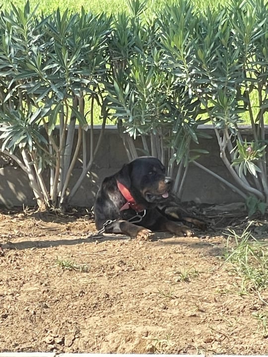Bei 40C Hitze sitzt der Rottweiler( Kampfhund )da in der Sonne täglich verzweifelt .Das war im August wo die Brände waren so heiß war es da bei Everenseki