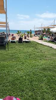 Blick von unserer Liege. Es gibt Rasenplätze und Liegen im Sand. So wie jeder mag.