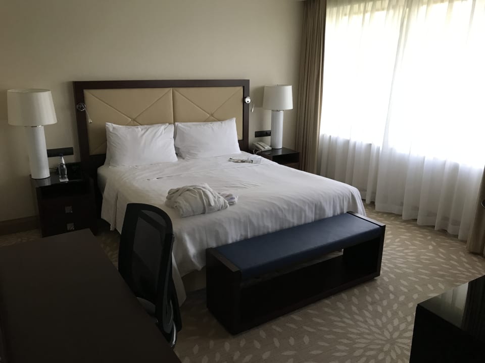 ZimmerSuite: Schlafbereich mit sehr komfortablem Bett und Annehmlichkeiten wie Wasser und Bademantel. Viele Steckdosen zu beiden Seiten des Bettes.