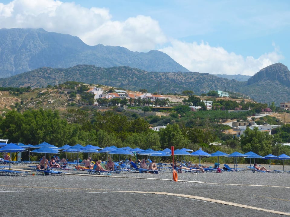 Blick vom Strand auf das Hotel Aroma Creta am Berg