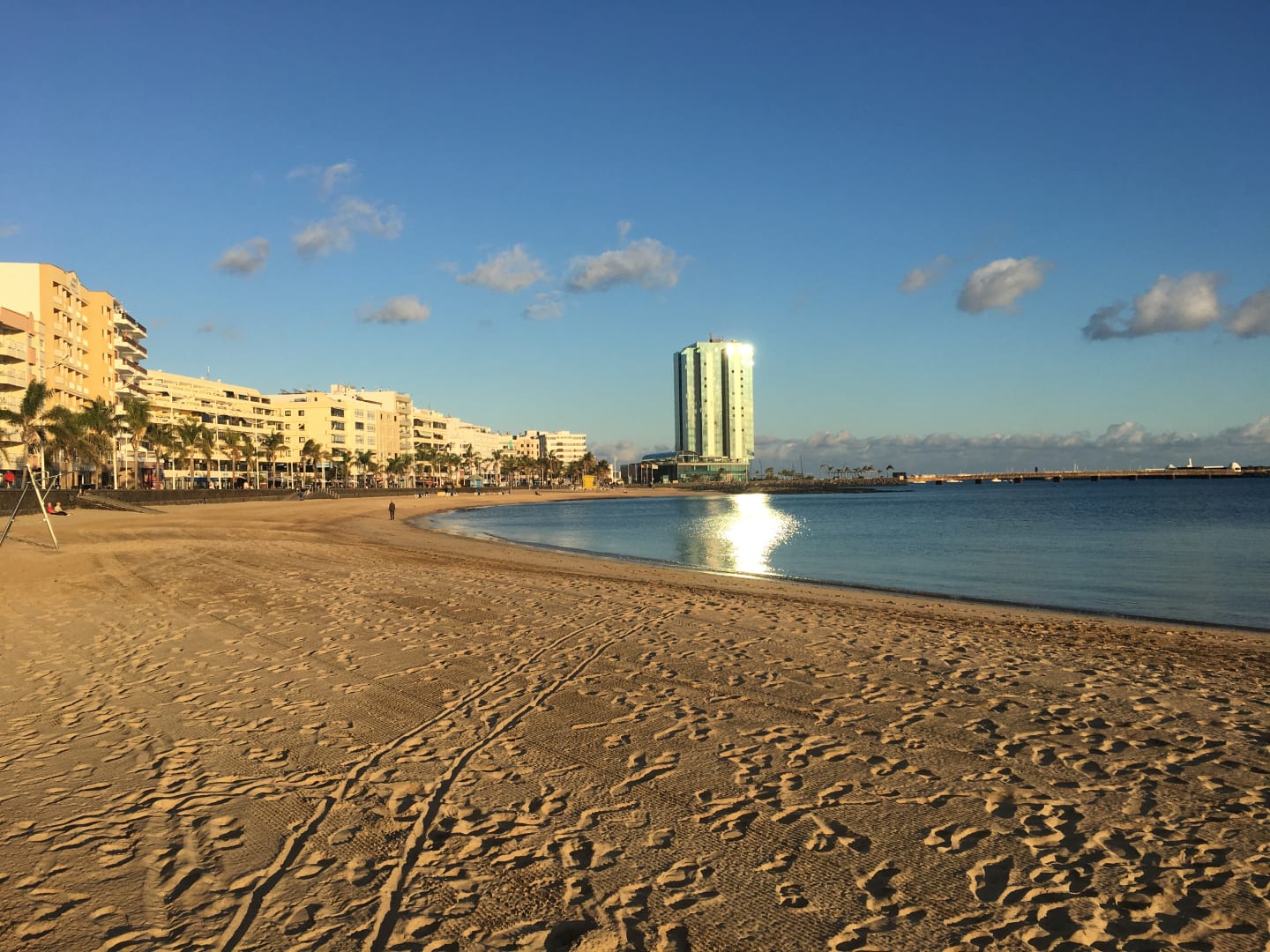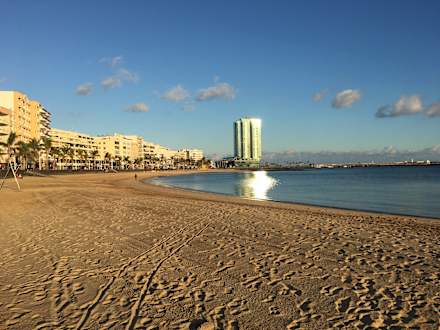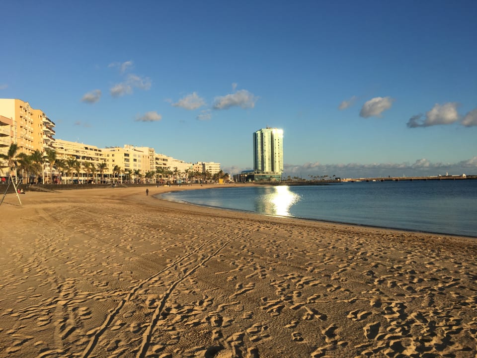Strand direkt am Hotel mit Hotelgebäude in der Mitte des Bildes (Hochhaus)