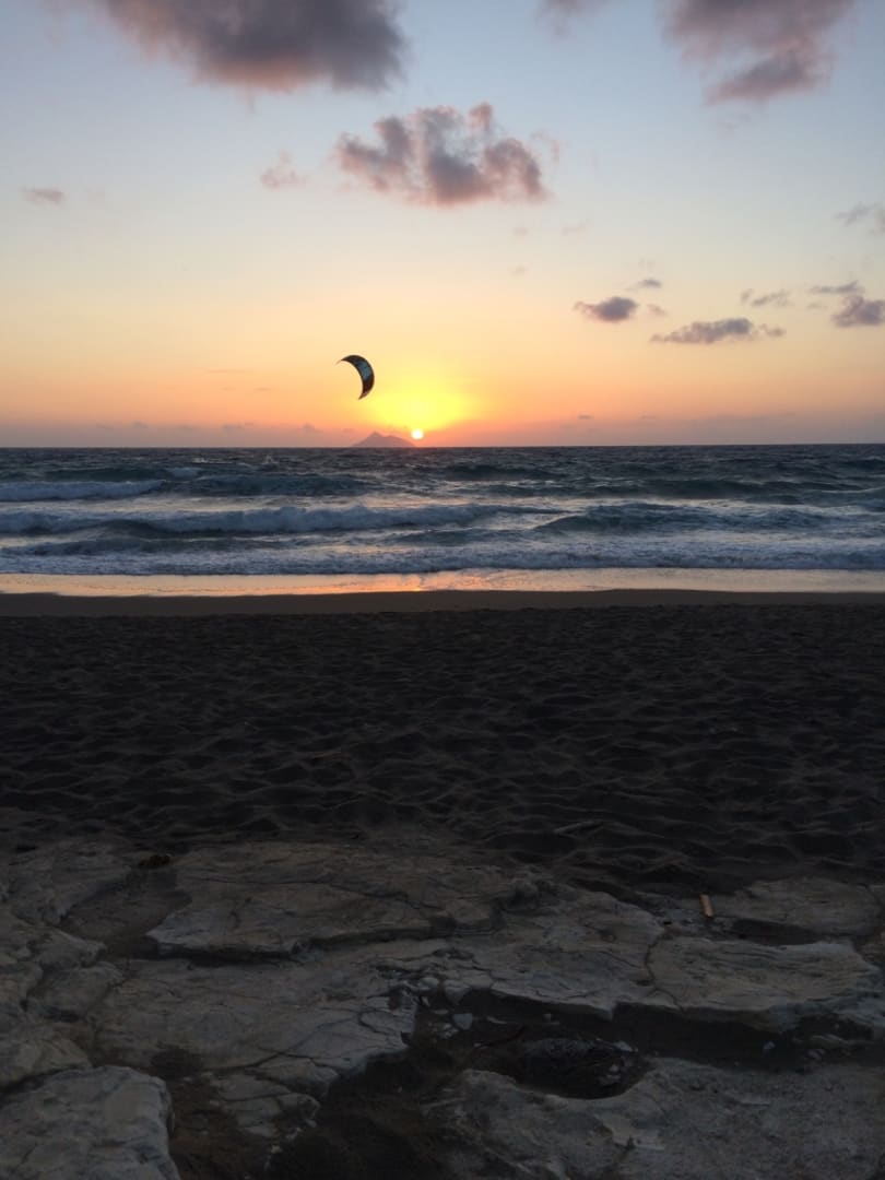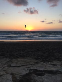 Sonnenuntergang am Strand Kalamaki mit Kitesurfer im Hintergrund! Oktober.