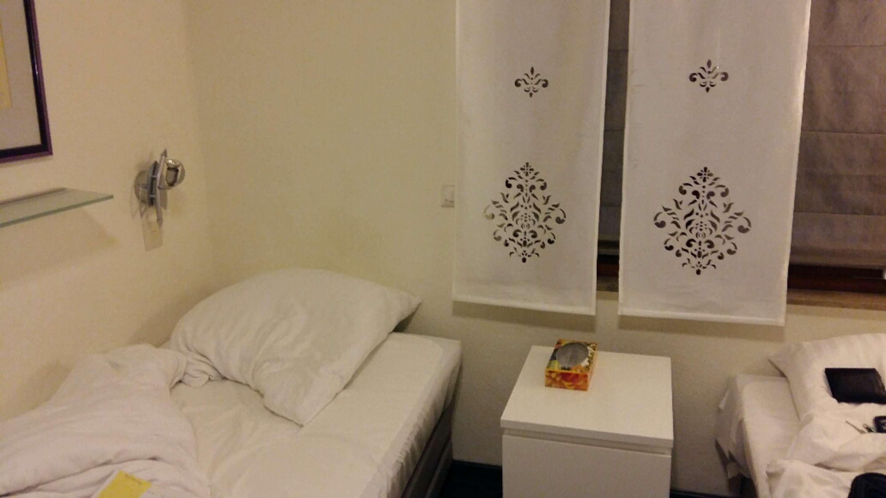 Glas-Regal mit spitzen Kanten direkt über dem Bett macht Sinn...Möbel-Sammelsurium - das Bad habe ich erst gar nicht fotografiert, da museumsreif!