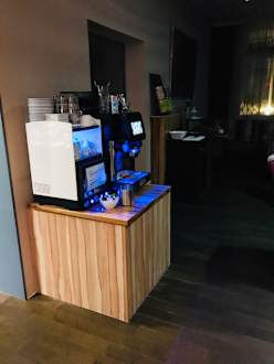 Kafeemaschine im Frühstücksraum, dahinter Buffet