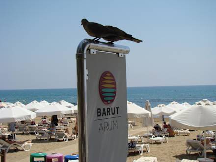 Die Tauben warten an der Beachbar auf Leckerlis von den Tischen. Das Schild befindet sich zwischen Beachbarabgrenzung und Promenade. Im Hintergrund der Hotelstand