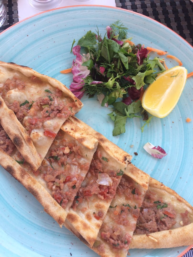 Pide mit Hackfleisch, ein Gericht des Strandrestaurants. Sehr lecker!