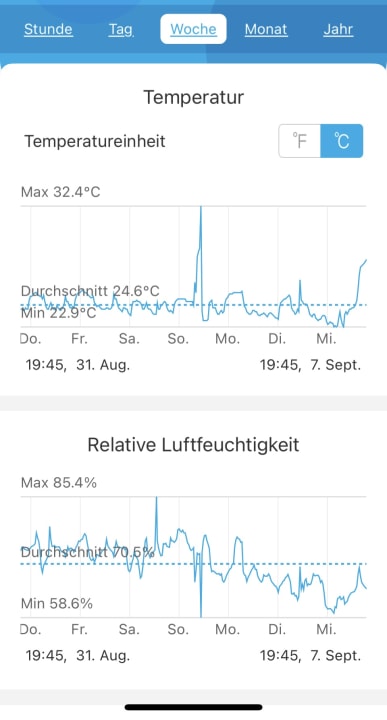 Temperaturmessung im Verlauf von 10 Tagen im Zimmer. Die Klimaanlage lief quasi von morgens bis abends voll durch. Die hohe Luftfeuchtigkeit kann von der alten Anlage nicht wirkungsvoll gesenkt werden.